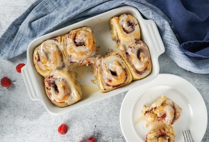 - While your dough is rising, you can begin your filling by adding your raspberries in a saucepan over medium heat. Stir in vegan butter, cinnamon, and sugar and whisk until a thick sauce is formed. About 3-5 minutes. Turn heat off and let cool