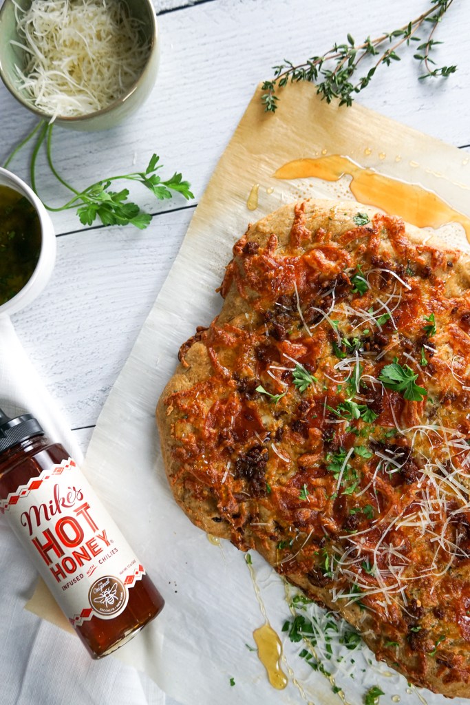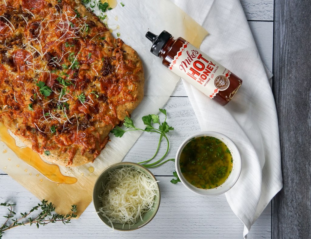 - Transfer pan to oven and bake for 15 minutes. Depending on thickness or type of pan used could depend on amount of cook time, so make sure to keep an eye on your pizza. Let pizza rest for a couple minutes, drizzle with Mike’s Hot Honey, and slice. Enjoy!