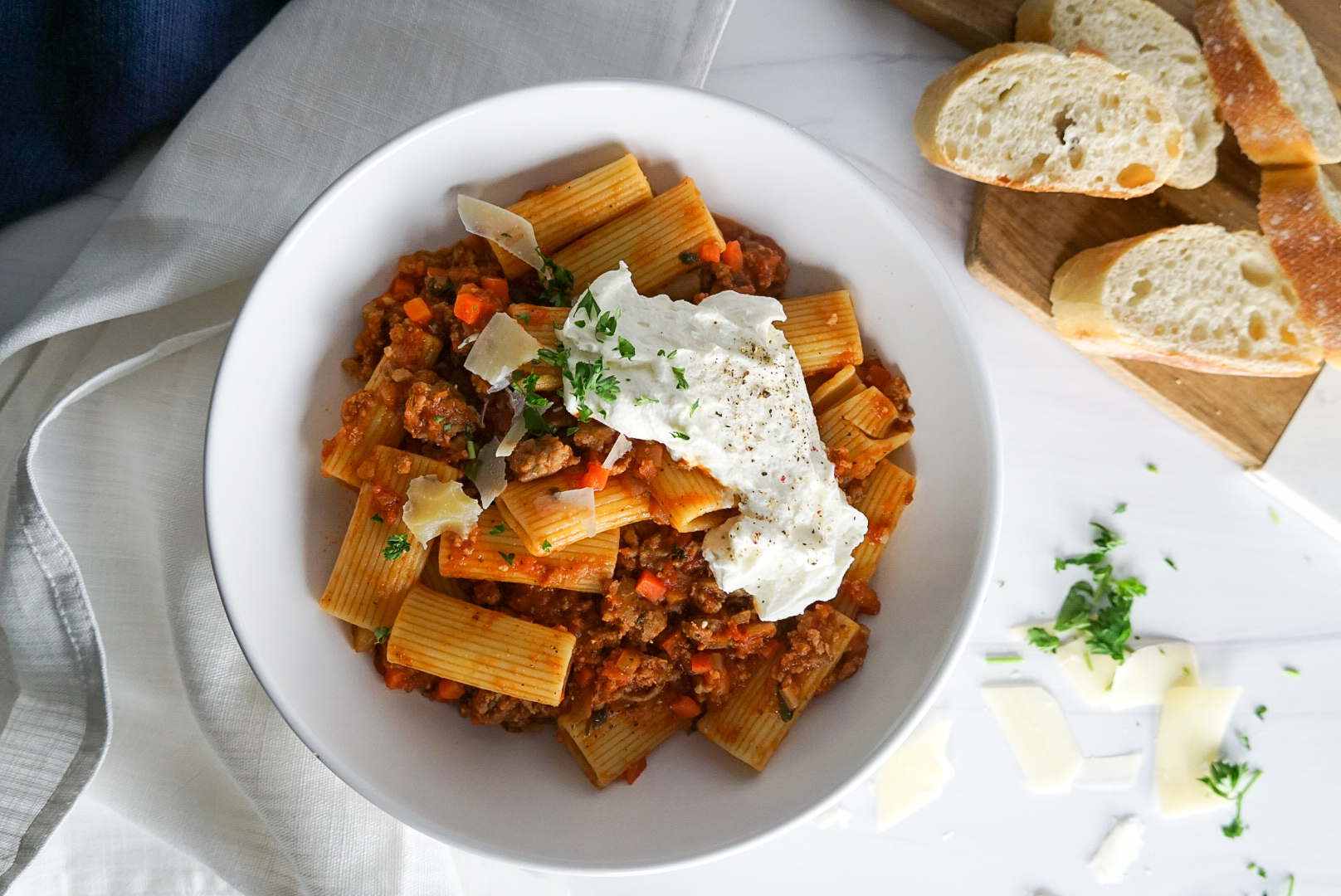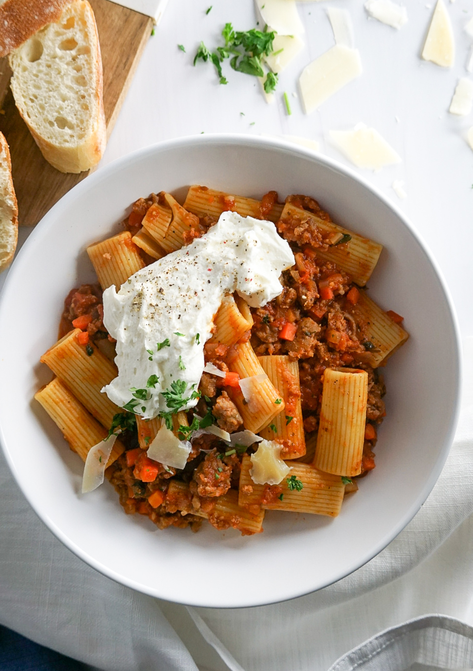 Spring is finally here and so is the rain! Yesterday we had random pours with a sprinkle of tornado warnings. So let’s be honest, cozy comfort food is still very much a thing in my house at the moment. Which is why this pasta bowl is so much happiness right now. Rigatoni tossed with a sauce made with ground turkey, Italian sausage, and diced carrots and finished with whipped ricotta…. yessss! So much yes to this!